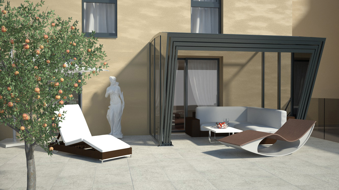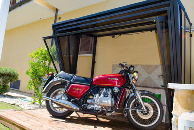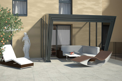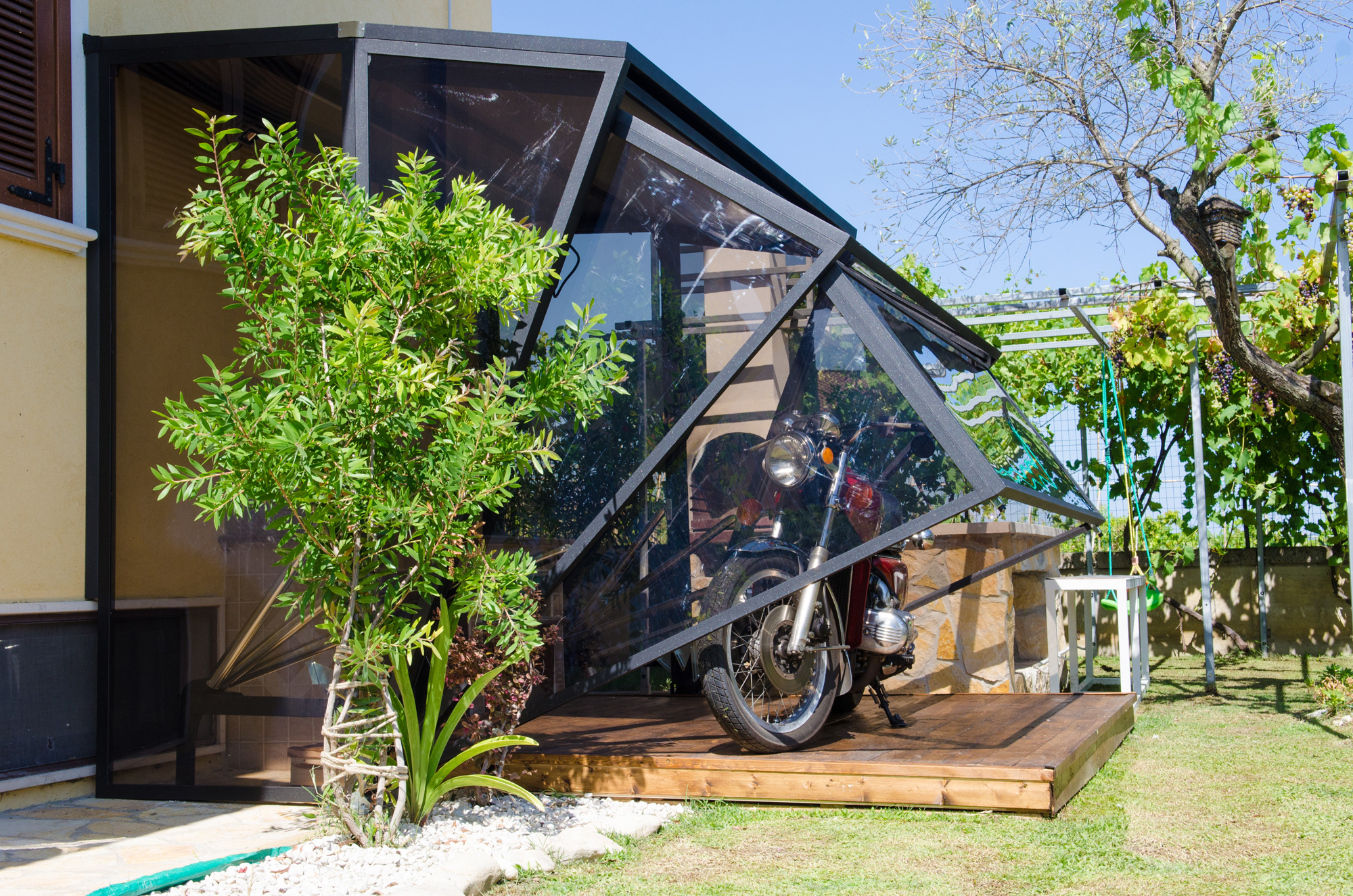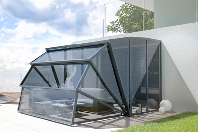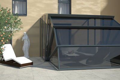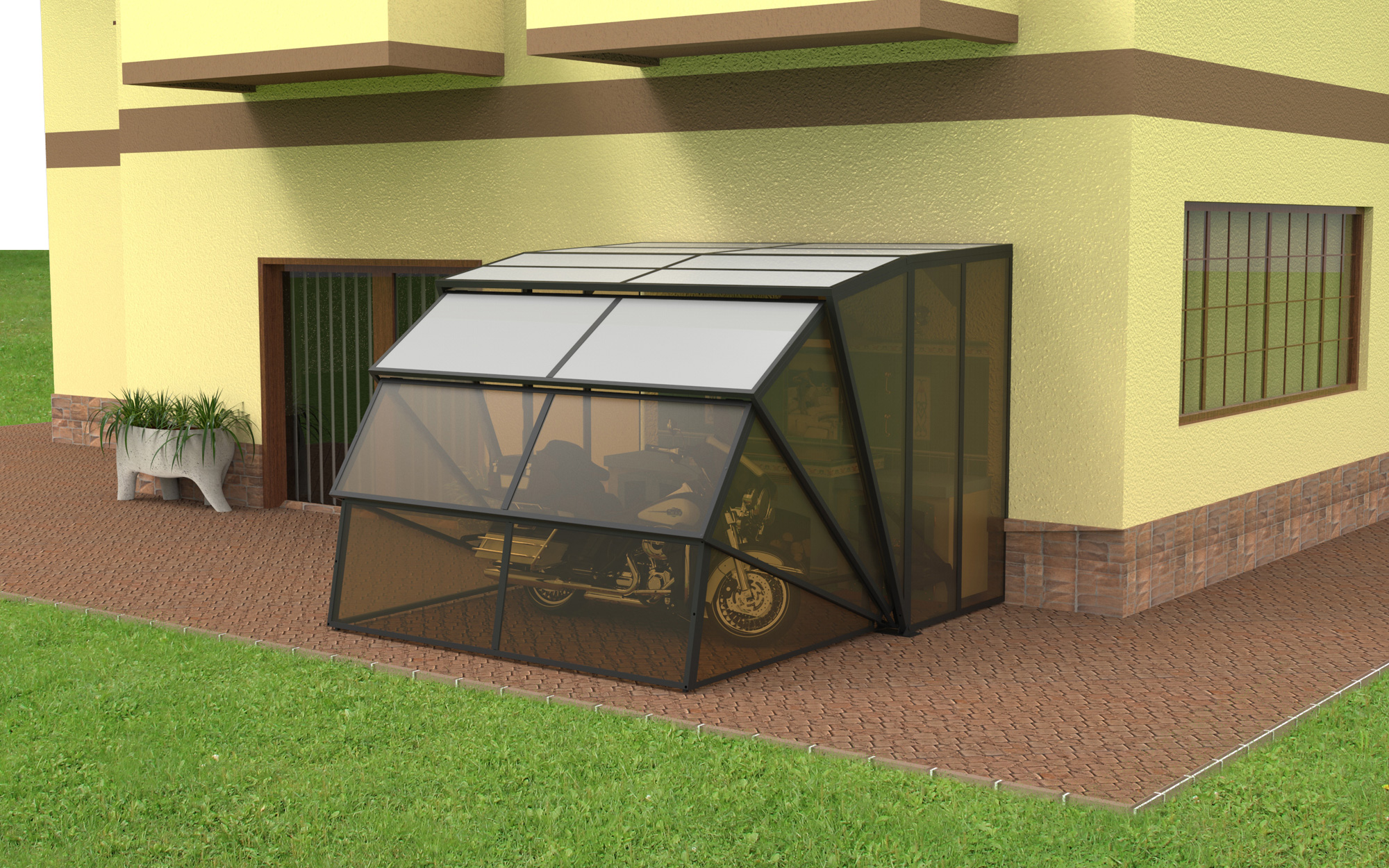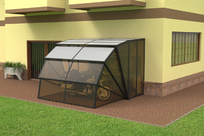 手動開閉式(オプションにてリモコン開閉も可能) フレーム素材:鉄製パウダー塗装 ルーフ部分パネル素材:4mmアルミニウム その他パネル素材:4mm厚スモークポリカーボネート